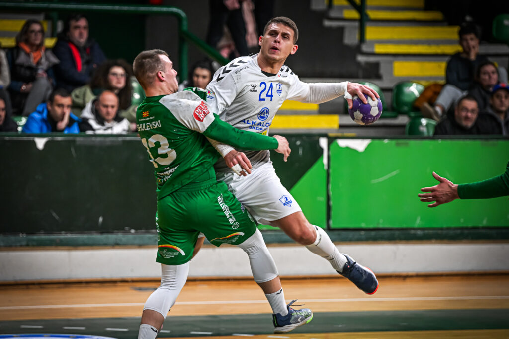Следните десет минути од натпреварот минаа во резултатски поизрамнета игра, а во последната третина од првото полувреме, РК Алкалоид уште еднаш изврши притисок врз домашните ракометари и резултатот од шест гола разлика во 20 минута (12-8), прерасна во многу поубедливо водство (17-8) во 24 минута од мечот за конечно на полувреме да биде 20-12.